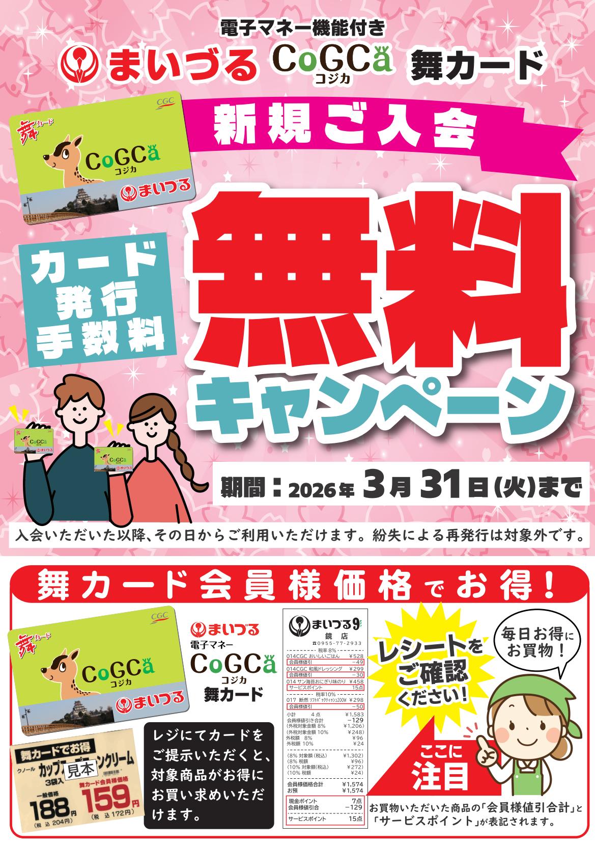 まいづるコジカ舞カード新規ご入会無料キャンペーン開催中!まいづるコジカ舞カード 新規ご入会 カード発行手数料無料キャンペーン開催中!期間中にご入会いただくと、カード発行手数料200円が無料になるキャンペーンです。※紛失による再発行は除きます。まいづるコジカ舞カードは、ご入会いただいたその日からご利用いただけます。店頭にて入会申込書付きチラシを配布しております。事前にご記入いただくと、入会手続きがスムーズです。この機会にぜひご入会ください。 皆様のご来店心よりお待ちしております。